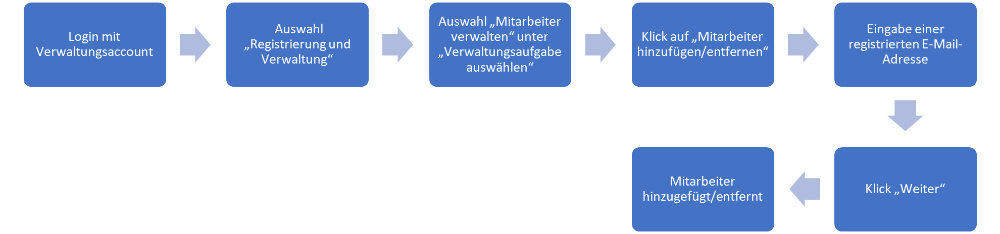 Sobald Ihr Verwaltungsaccount freigeschaltet wurde, können Sie diesem Mitarbeiteraccounts zuordnen, indem Sie registrierte Benutzer mittels ihrer E-Mail-Adressen zu Ihrem Verwaltungsaccount hinzufügen.